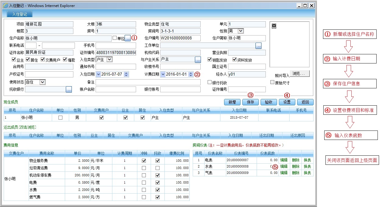 在入住登记页面中录入住户信息,完成收费项目及收费标准设置,如图: