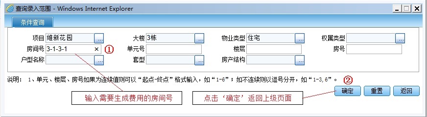 上图中点击‘生成’时,会弹出一范围选择页面,根据需要设置生成费用的物业范围,这里只生成3-1-3-1房间的费用,所以在页面中房间号一栏输入3-1-3-1,如图: