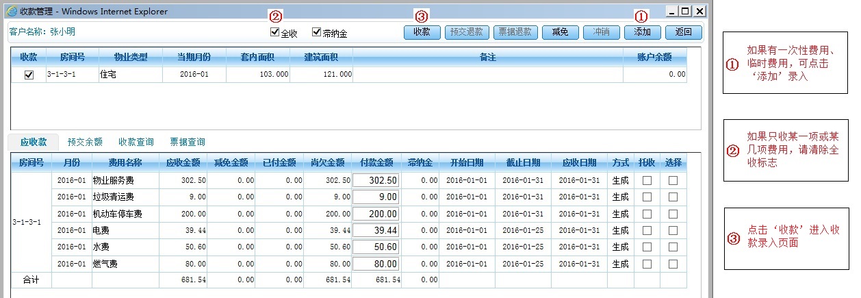 收款录入页面操作如下图: